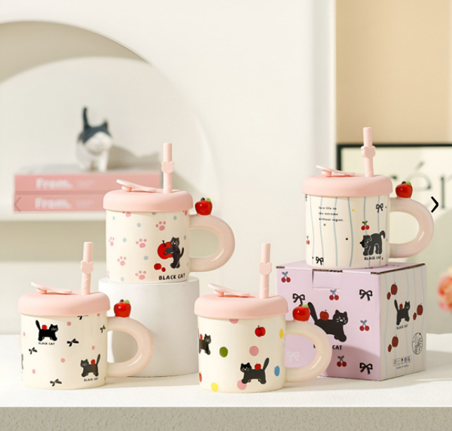 Taza de cerámica con tapa y sorbete de silicona BLACK CAT GATITO (XC-M-2308)