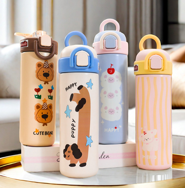 Botella de acero doble pico con sorbete PERRITO RAYAS AMARILLO Y ROSA (TB2024-6113)