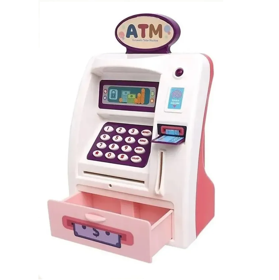 Alcancía cajero automático infantil ROSA con contraseña y tarjeta a pilas