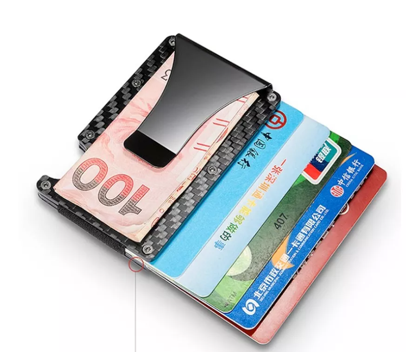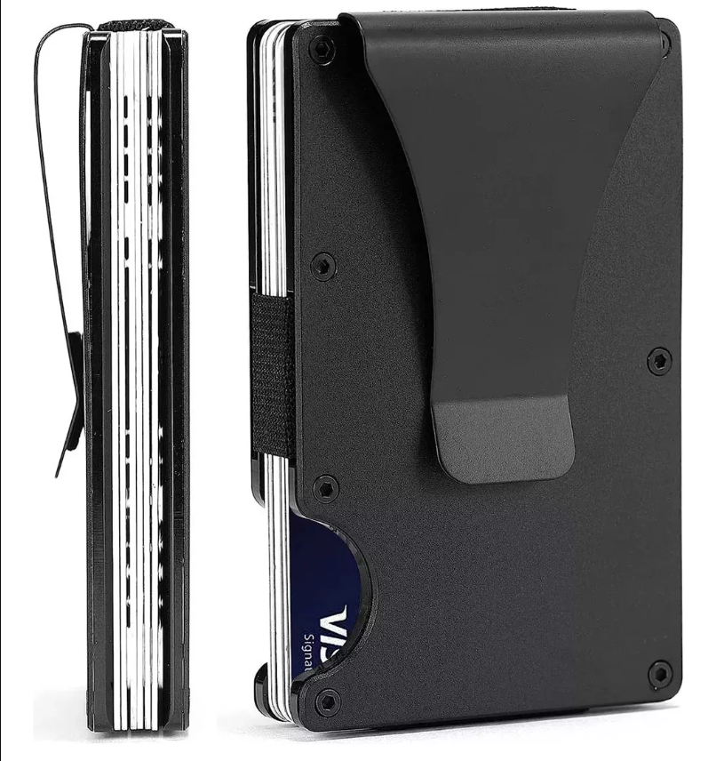 Tarjetero billetera de aluminio con clip para billetes en cajita negra