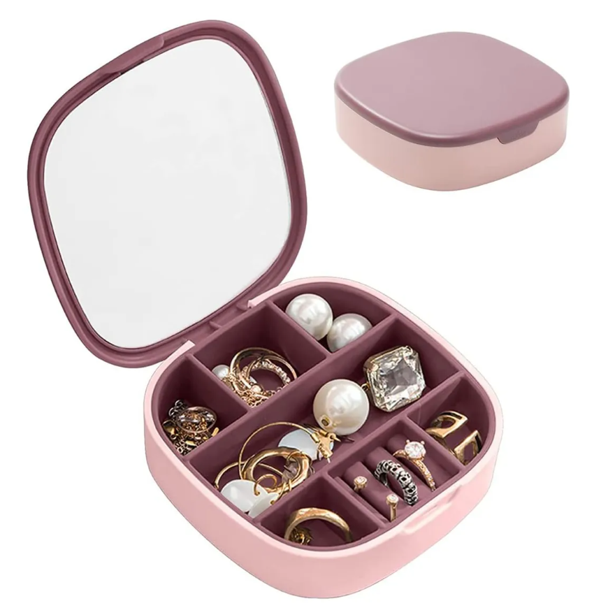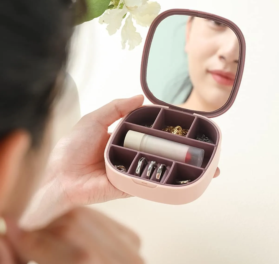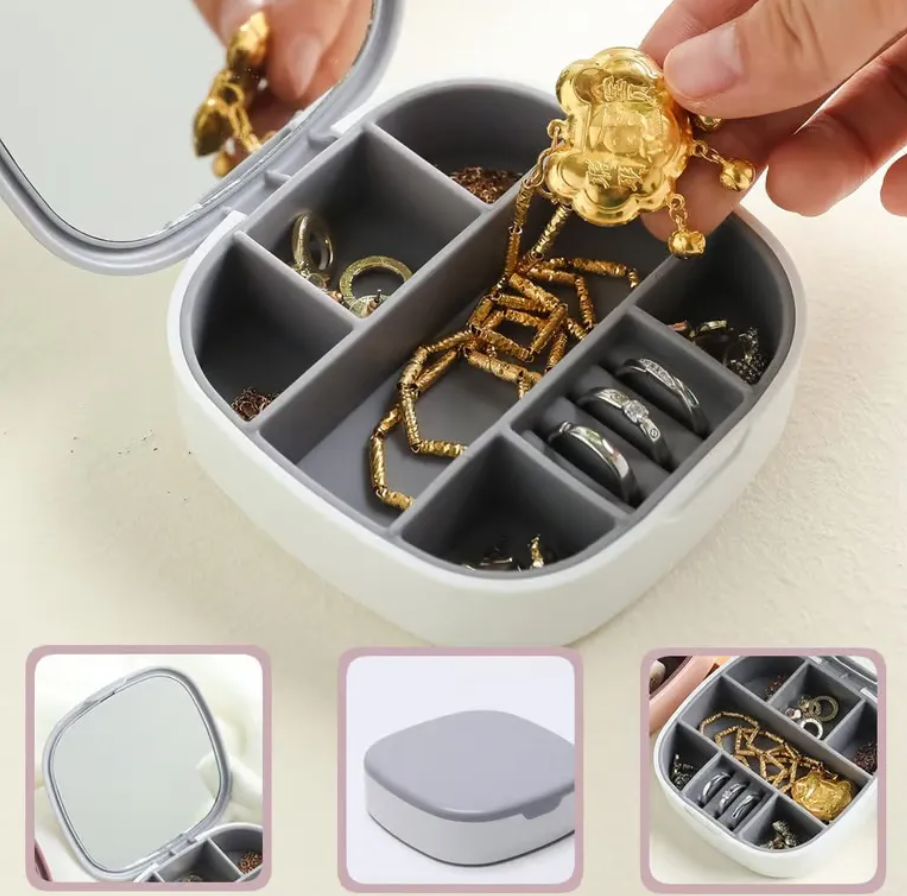 Mini alhajero organizador de joyas de plástico con separadores y espejo 10cm (LD-988)