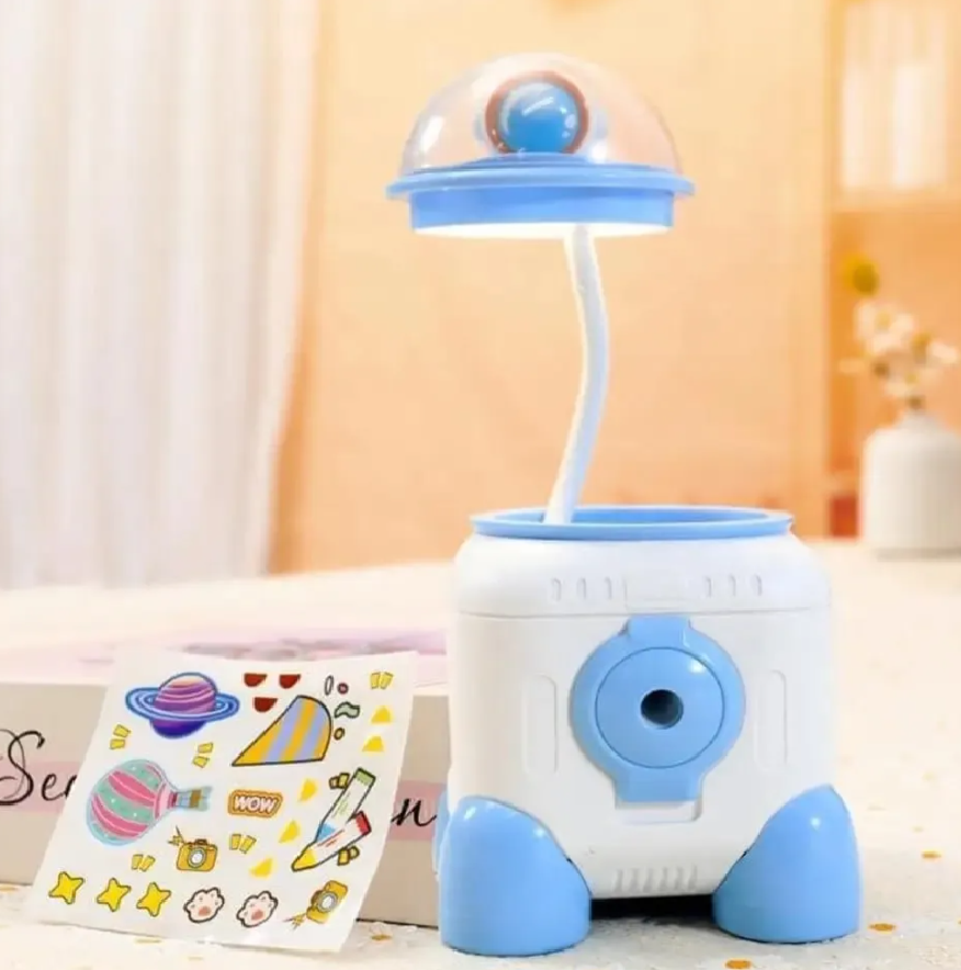 Lámpara LED recargable ASTRONAUTA NAVE con porta lápices y sacapuntas (Q1014)
